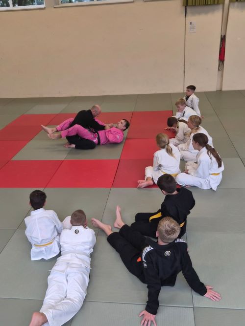 Mittags begann es für die Ju-Jutsu-Kids mit dem „Guardspiel“. Dabei ging Stefan auf das besondere Zusammenwirken von Guard und Postura ein. Natürlich demonstrierte er im Anschluss mögliche Formen der Befreiungen.
