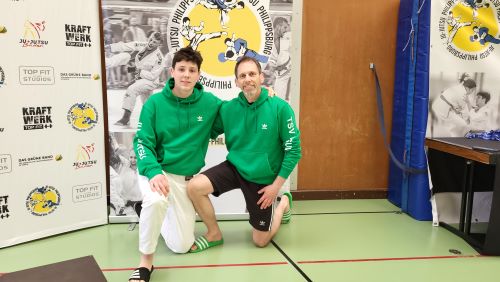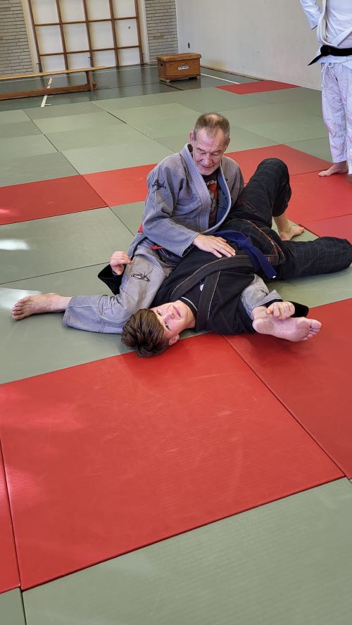 Zur Unterstützung hatte er als Uke seinen Sohn Alex (2. Kyu JJ) dabei,