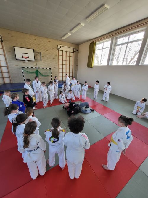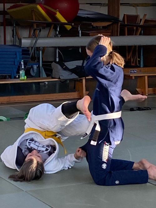 Am frühen Nachmittag brachte er den rund 30 teilnehmenden Kids zunächst diese Technikwelt näher, dabei hatte er tatkräftige Unterstützung von Conni Bader (3.Kyu JJ, Brown Belt BJJ) vom ATS Buntentor, der hier spontan als Partner einsprang und dadurch den Lehrgang mehr als nur bereicherte.