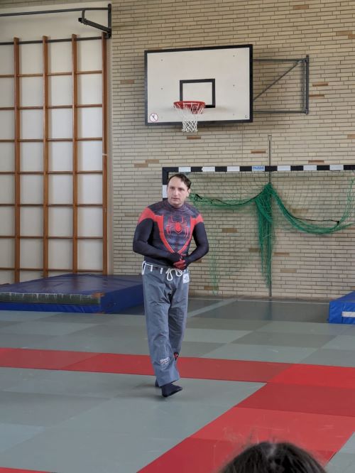 Stefan, Landessportwart des Verbandes, schlüpfte hier passend zu dem Motto: Spider-Techniken und deren Ein- und Übergänge in sein Superheldenkostüm.