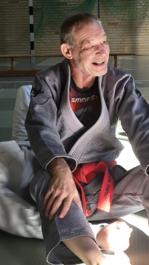 Nach einer Gedenkminute für den kürzlich verstorbenen Erich Reinhardt, der das Ju-Jutsu in den „Kinderschuhen“ in Deutschland mitgeprägt hat, brachte Achim auf seine ihm unnachahmliche Weise die Teilnehmenden am Samstag und Sonntag auf Betriebstemperatur und machte sie aufnahmebereit für die vielfältigen Techniken in Stand und Boden.