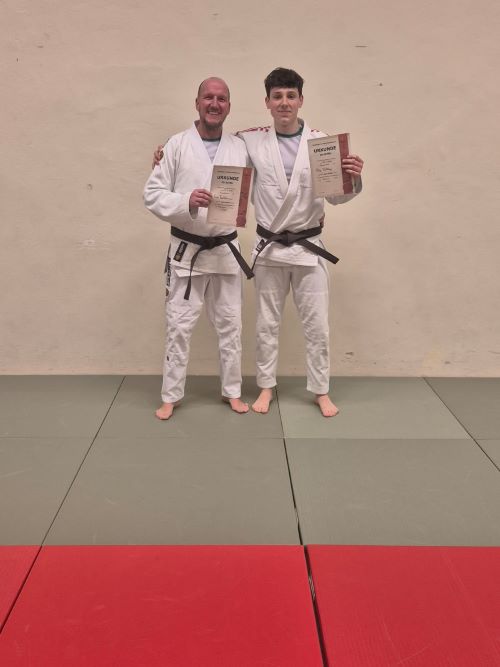 Mit der Qualifikation im Newaza als erster Jugendlicher aus Bremerhaven zur Deutschen Schüler:innenmeisterschaft war das Sportjahr für Mitja im Sommer noch nicht zu Ende. Vor dem 16-Jährigen, der in der Kindergruppe unterstützt und seit Kurzem sich auch an einer Ausbildung zum Übungsleiter versucht, lag mit seinem genau 40 Jahre älteren Trainingspartner Sven ein strammes Trainingspensum. Sven der schon vor 2 Jahren nach fast 20-jähriger Abstinenz wieder zum Ju-Jutsu gefunden hat, konnte hier in freien Praxisbezügen einmal mehr von seiner langjährigen Wettkampferfahrung profitieren. Beide Prüflinge konnten dank der Vorbereitung in ihrer Trainingsgruppe mit einer hervorragenden Leistung ihre Prüfung zum Braungurt (1. Kyu) im Ju-Jutsu ablegen.